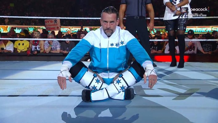 The tone of most if not all Punk’s matches are set before the bell even rings, it starts when he makes his entrance, you seen it in his face this isn’t just another match, this is the final battle in a superhero movie which is kind of ironic considering Punks beautiful Fantastic Four inspired gear.