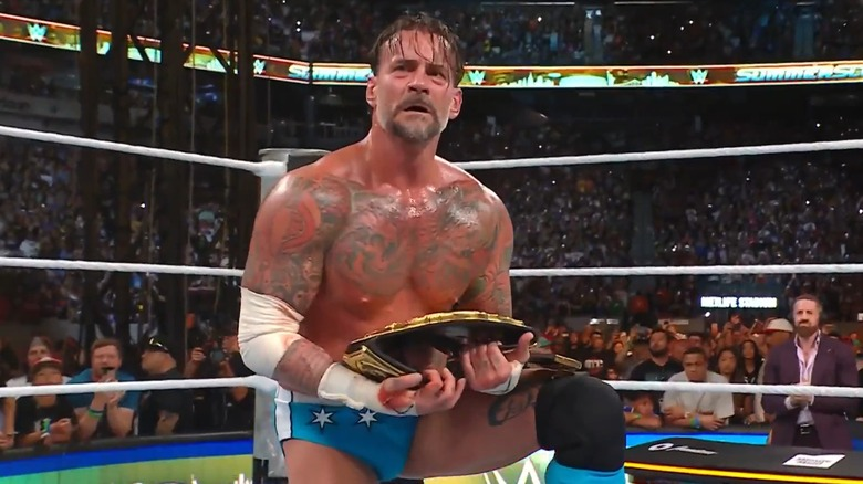 The bell rings, my hearts already beating fast, I’m nervous beyond belief and then i just get lost. The match starts of with some fights over control until CM Punk finally is able to get some work on Gunther’s arm and just works over Gunther’s arm for a bit, Gunther gets some separation and goes for a chop and punk blocks it and it hurts the worked over arm, Punk was able to avoid the chop for a little and work the arm a little more but Gunther finally caught him, one chop wasnt enough as punk was able to get back and focus on the arm, Gunther goes for another chop and Punk blocks it again stunning Gunther. Punk goes on the attack, giving Gunther some of his own chops, Punk goes for a his trademark crossbody and gets a chop to the leg and punk is now stuck in the tree of woe, this seems to turn the tide, Gunther finally takes control, punk throws some punches trying get some separation and Gunther throws a monster chop and seems in firm control now. Gunther starts just working over punks midsection now, stretching punk of with an abdominal stretch, punk goes for his own and the two jockey for position and Gunther stops punk with a crazy big boot. Gunther throws a series of chops, he’s firmly in control by now. Punk keeps trying to mount some offense but he’s repeated stopped by a Gunther bomb, Gunther chops punk and he falls out the ropes and Gunther chops punk as bounces of the ropes like Terry Funk. Gunther is soaking it in, the crowd is sitting in angst. Punk sells Gunther’s offense so well, he’s sitting there like everything stings grabbing at his chest that’s red and bleeding by this point. Punk is breathing heavy and trying to just get away from Gunther by this point. None of Punks offense has an effect on Gunther here, he’s trying with all his might but its doing little to nothing to the fresher Gunther. Gunther is yelling at Punk, hes begging for Punk to hit him harder but punks offense is being supressed by being worn down by Gunther. Punk catches Gunther in the air and tries to lock in a sharpshooter and is kicked off by Gunther. Gunther locks his own Sharpshooter in the middle of the ring, Punk gets his way out of his and finally has some sort of control and locks in his own sharpshooter, Gunther is able to get to the ropes, Punk is exhausted and Gunther catches him off guard with a german. Punk is finally able to string together some offense, dropkick, neck breaker and tries a running knee but is caught with a powerbomb, Gunther then throws some insane lariats, stopping any attempt Punk makes at turning the tide, Punk is persistent and wont stay down but Gunther’s power is stopping him at every turn. Gunther lays punk down on the top turn buckle, strikes him down and Punk falls out the ring. Gunther is probably my fav at playing goliath in matches, he’s so mean and disrespectful when he’s in control, he throws punk in to the ring post on the outside and then starts taunting on top off the announce table, this costs Gunther punk catches Gunther off guard and knocks Gunther off the table, Gunther resurfaces and has a crimson mask, he’s dazed and rattled, he’s tries to make his way to the ring, Gunther has blood in his eyes, he’s on his back foot, shocked to see his own blood and trying wipe the blood off his face as punk comes forward throwing punches rocking Gunther, Gunther is in the corner fighting for his life, Gunther pushes Punk off and Punk runs back with a knee, he gets Gunther in position and hits the elbow drop and tries to set up for a GTS but Gunther fights out and goes for a sleeper, Punk is fighting, he wont give up, he’s will himself up an gets Gunther up and hits the GTS finally, Gunther isn’t down yet and is staggered and Punk hits another one, 1…2…3….Punk wins Punk wins Punk wins.